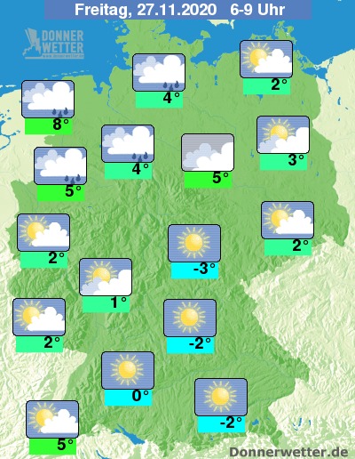 Bis zu den Frühstunden kühlt die Luft auf milde 8 Grad an der Nordseeküste und frostige -3 Grad im Frankenwald ab. Vornehmlich im Süden gibt es auch leichten Frost und die Gefahr von Reifglätte.