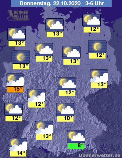 Bis zu den Frühstunden kühlt die Luft auf 10 bis 15 Grad ab, südlich der Donau, sowie im Alpenvorland sinken die Temperaturen oft in den einstelligen Bereich.