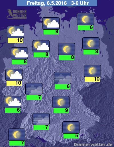 In der folgenden Nacht bleibt der Himmel über der Südosthälfte praktisch druchweg sternenklar. Über den Norden und Westen ziehen jedoch auch hier und da einige Wolkenfelder durch, es bleibt jedoch überall trocken. Die Tiefstwerte liegen bei etwa 10 Grad in Düsseldorf und um 5 Grad in der bayerischen Landeshauptsatdt.