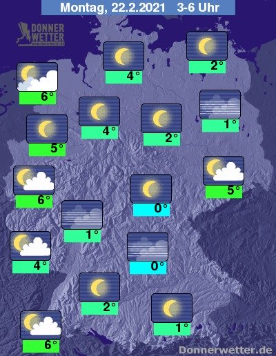 In der bevorstehenden Nacht zeigt sich der Himmel über Deutschland meist sternenklar, vor allem westlich von Rhein und Ems sind aber auch einige Wolkenfelder möglich. Es bleibt überall trocken bei Tiefstwerten von 6 Grad an der Nordsee und bis 0 Grad im Eichsfeld.