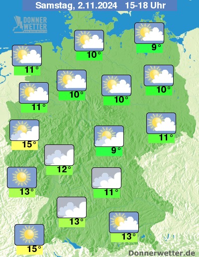 Am Samstagnachmittag zeigt sich der Himmel verbreitet heiter oder es ist nur gering bewölkt, vor allem in der südlichen Mitte kann es auch stärker bewölkt sein und etwas Sprühregen ist möglich. In den höheren Lagen des Südwesten sowie in den Alpen scheint die Sonne auch häufig von einem wolkenlosen Himmel.