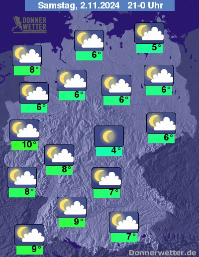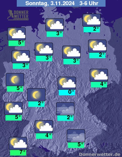 In der Nacht zum Sonntag ist der Himmel verbreitet sternenklar oder nur gering bewölkt, vor allem im Süden und Südwesten bildet sich verbreitet Nebel oder Hochnebel.