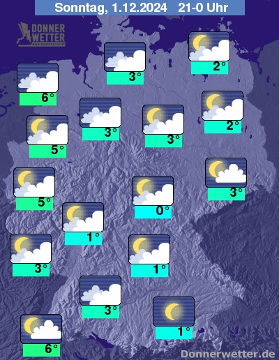 In der Nacht zum Montag ist es teils nebelig oder hochnebelartig bewölkt, teils aufgelockert bewölkt oder klar. Von Westen und Nordwesten nimmt die Bewölkung im Nachtverlauf weiter zu, in den frühen Morgenstunden setzt dann auch Regen ein. In den Übergangsbereichen zu den Frostgebieten besteht Glättegefahr.