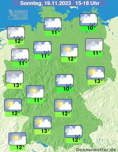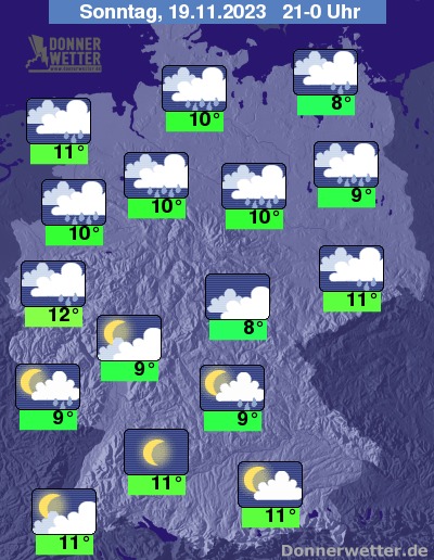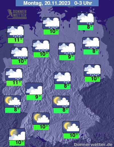 In der Nacht auf Montag fällt über der Nordhälfte und der Mitte weiterhin verbreitet Regen, nach Süden hin sind bei meist aufgelockerter Bewölkung nur selten Niederschläge zu erwarten. In weiten Landesteilen weht ein starker bis stürmischer Wind, auf den Gipfeln sich auch Sturmböen oder schwere Sturmböen möglich.