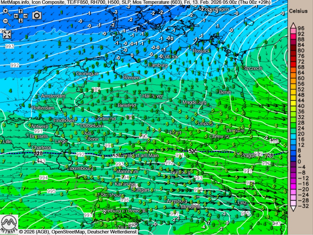 Die Wetterkarte mit Schnee und Regen sowie die Strömungs- / Temperaturkarte für Freitagmorgen (06:00 Uhr) und die 24-Stunden-Schneemengen nach ICON: