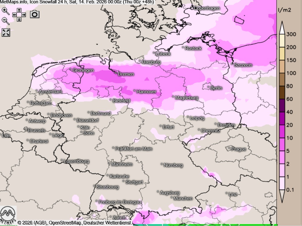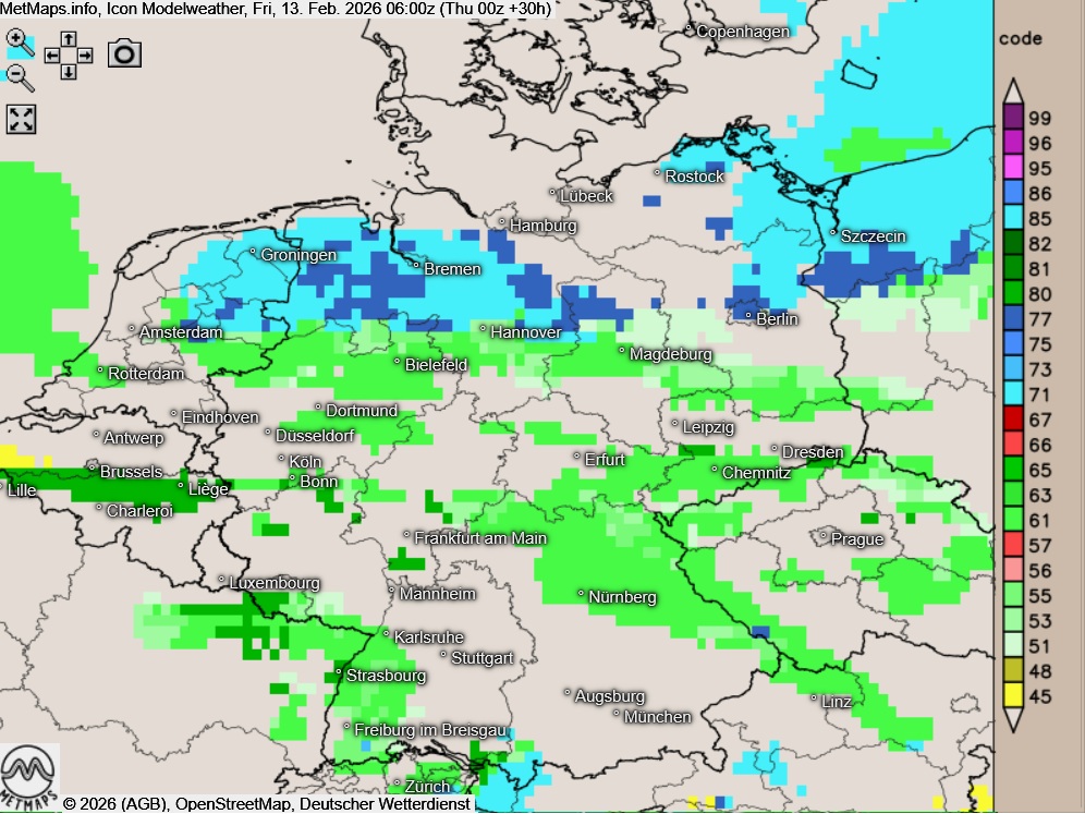 Am Freitag zeigt sich der Himmel über dem äußersten Süden und Südosten wechselnd bewölkt, in Alpennähe ist es auch längere Zeit sonnig, und es bleibt meist trocken. Sonst ist es verbreitet stark bewölkt oder bedeckt, dabei fällt von Südwesten bis in die Mitte teils schauerartig verstärkter Regen, im Norden und Nordosten auch Schnee - Vorsicht Glättegefahr!