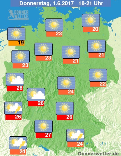 Am Abend ist vor allem zwischen Pfalz und Schwarzwald und am Alpenrand noch mit weiteren Gewittern zu rechnen, sonst scheint weiterhin ungetrübt die Sonne.