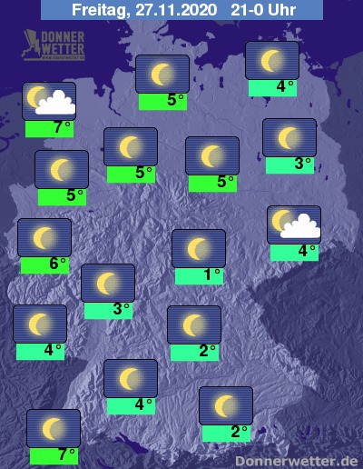 Vor Dämmerungsbeginn liegen die Temperaturen allgemein zwischen 6 und 13 Grad, bei Einheitsgrau im Süden bleibt es kühler.