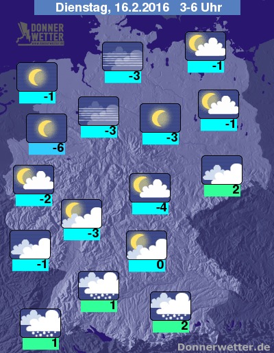 In der zweiten Nachhälfte lassen die Niederschläge immer mehr nach, in weiten Teilen der Nordhälfte lockert der Himmel auf und es bleibt trocken. Vereinzelte Schneeregen- oder Schneefälle sind vor allem zwischen Oberrhein und Berchtesgadener Land zu erwarten. Die Temperaturen sinken auf Werte um 3 Grad C am Alpenrand und -5 Grad im Nordwesten.