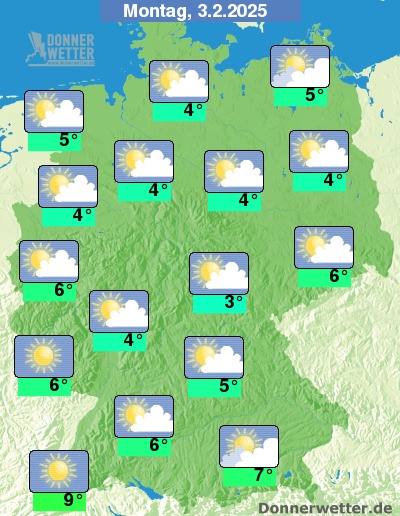 Am Montag zeigt sich der Himmel nach Nebelauflösung über weiten Teilen des Landes heiter bis wolkig. Stärkere Bewölkung hält sich weiterhin über der Nordosthälfte, es bleibt aber meist trocken. In den Niederungen Süddeutschlands hält sich teils ganztägig zäher Nebel.
