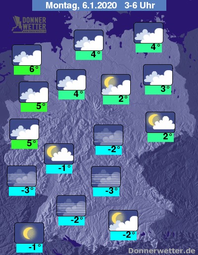 In der folgenden Nacht zeigt sich der Himmel über der Nordhälfte Deutschlands verbreitet stark und nur hier und da auch mal aufgelockert bewölkt. Weiter nach Süden hin ist es meist sternenklar und sonst locker bewölkt, stellenweise kann sich Nebel bilden. Es bleibt landesweit trocken bei Tiefstwerten von 6 Grad in Wilhelmshaven und -3 Grad im Saargau.