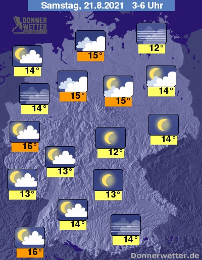 In der Nacht zum Samstag zeigt sich der Himmel über Deutschland häufig sternenklar, vor allem im Norden, aber auch im übrigen Land können auch mal dichte Wolken durchziehen, dazu bleibt es aber trocken. Die Temperatur sinkt auf 16 Grad im Rheinland und bis 12 Grad im Vogtland.