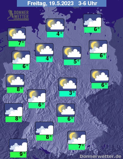 In der Nacht auf Freitag zeigt sich der Himmel vor allem im Norden und der Landesmitte nur gering bewölkt, teils ist es auch sternenklar; sonst dominiert ein Mix aus wechselnder bis aufgelockerter, über dem Südwesten und Osten auch starker Bewölkung. Es bleibt aber trocken.