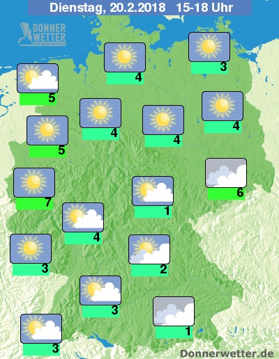 Im weiteren Nachmittagsverlauf gibt es vor allem in der Nord- und Westhälfte strahlenden Sonnenschein, im Süden ziehen ab und an auch mal lockere Wolken durch. Eine geschlossene Wolkendecke hält sich meist nur noch über dem Erzgebirge sowie dem Alpenrand.