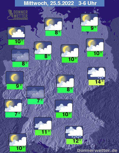 In der folgenden Nacht bleibt es über dem Südosten des Landes und über Sachsen bedeckt und es fällt gebietsweise Regen. Im übrigen Land ist es verbreitet locker bis wechselnd bewölkt und vor allem im Westen auch oft sternenklar, dazu bleibt es trocken. Die Temperatur sinkt auf 14 Grad in Dresden und 7 Grad in Saarbrücken.