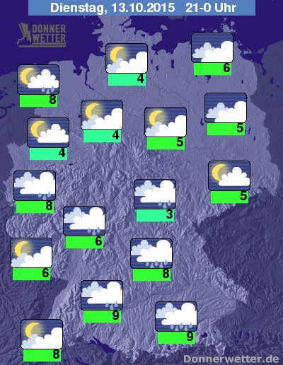 Heute Abend bleibt es über der Bundesrepublik verbreitet stark bewölkt, Auflockerungen sind am ehesten in den westlichen Landesteilen, in Sachsen und auch in Norddeutschland möglich. Insbesonders von Bayern bis nach Thüringen hinein fällt vielerorts langanhaltender und teils auch ergiebiger Regen, aber auch im Westen und im Nordseeumfeld ist gebietsweise Regen möglich. In den anderen Landesteilen bleibt es weitgehend trocken. Die Abendtemperaturen liegen bei 9 Grad in München und um 3 Grad im Grabfeld.