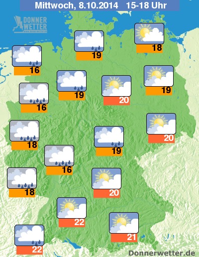 Heute Nachmittag ziehen besonders im Norden und Westen meist dichte Wolken übers Land und bringen dabei teils kräftigen Regen. Im Süden und Osten zieht zwar meist viele Wolken durch, dabei sind aber auch immer wieder Auflockerungen möglich und es bleibt meist trocken. Im Westen und Nordwesten des Landes weht ein teils stürmischer Wind, dabei sind einzelne Sturmböen möglich. Die Temperatur liegt bei 16 Grad an der Nordsee und etwa 22 Grad am Bodensee.