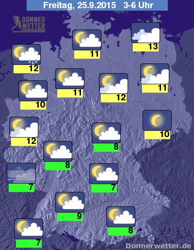 In der kommenden Nacht fällt im Nordwesten unter teils dichten Wolken noch gebietsweise Regen, sonst ist es hingegen verbreitet locker bis aufgelockert bewölkt und nur selten zieht auch mal starke Bewölkung durch, dabei bleibt es trocken. Die Temperatur sinkt auf 13 Grad in Rostock und bis etwa 7 Grad am Pfälzer Wald. Im Westen und Südwesten bildet sich stellenweise Nebel oder Hochnebel.