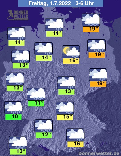 In der kommenden Nacht ist es anfangs noch teils aufgelockert bewölkt und oft noch trocken, jedoch ziehen von Westen her kompakte Wolken durch und es bilden sich verbreitet Schauer und teils kräftige Gewitter. Die Temperatur sinkt auf sehr milde 19 Grad in Berlin und auf etwa 10 Grad im Saargau.