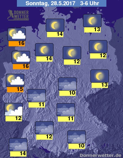 In der kommenden Nacht bleibt der Himmel größtenteils sternenklar. In die westlichen Landesteile zieht im Laufe der Nacht aus Westen jedoch teils lockere oder aufgelockerte Bewölkung hinein. Regen ist dabei jedoch keiner zu erwarten. Die Tiefstwerte liegen bei 16 Grad am Niederrhein und 10 Grad in Augsburg.