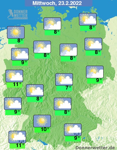 Am Mittwoch ist es vielerorts heiter bis sonnig, gebietsweise ziehen aber auch dichte Wolken durch, dabei bleibt es trocken. Die Temperatur steigt auf 7 Grad im Eichsfeld und bis 11 Grad im Oberrheingraben. An der Nordsee, im Nordosten und Osten ist es zum Teil stürmisch, an der Ostsee herrscht teils Sturm.