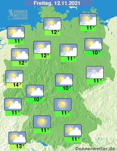 Am Freitag ist es teils stark bewölkt oder trüb, teils zeigen sich aber auch heitere Abschnitte, dabei bleibt es trocken. Die Temperatur steigt auf 10 Grad in Erfurt und bis 14 Grad in Köln.