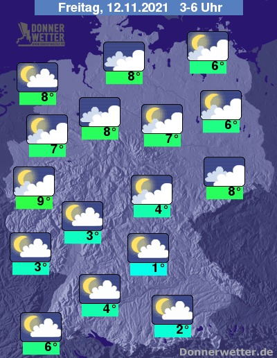 In der folgenden Nacht ist es hier und da stark, zumeist ist es aber wechselnd bis aufgelockert bewölkt. Im Süden und im weiteren Verlauf auch im Norden zeigt sich der Himmel verbreitet nur locker bewölkt. Es bleibt überall trocken bei Tiefstwerten von 9 Grad in Köln und bis 1 Grad in Nürnberg.