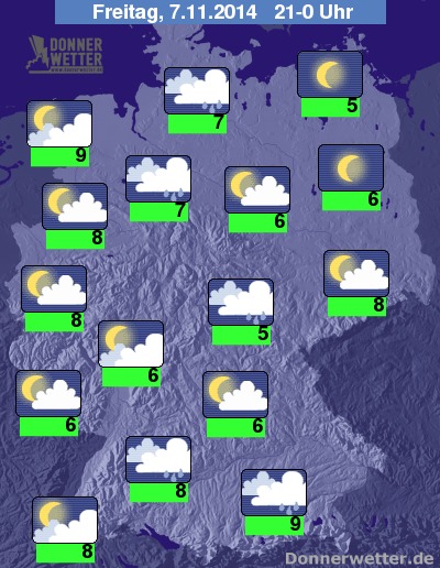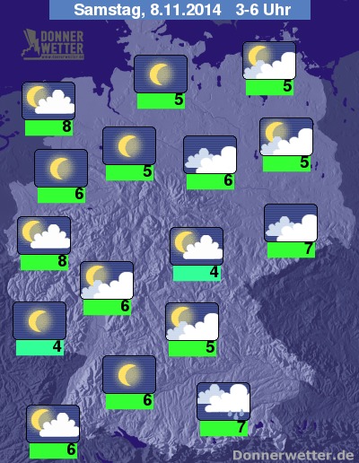 In der Nacht zum Samstag fällt im Süden und in der Landesmitte gelegentlich weiterer Regen, dieser verlagert sich jedoch in den Südosten des Landes, wo auch am Morgen noch leichter Regen erwartet wird, sonst klingt der Regen weitgehend ab. In den anderen Landesteilen ist es meist aufgelockert bewölkt, vor allem im Nord- und Südwesten auch häufig sternenklar und es bleibt weitgehend trocken. Die Temperatur sinkt auf 8 Grad an der Nordsee und bis 4 Grad am Thüringer Wald.