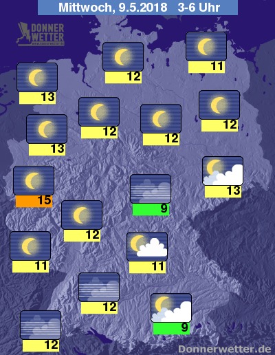 In der folgenden Nacht sind über Bayern und Sachsen einige, weitgehend jedoch nur lockere bis aufgelockerte Wolken möglich, sonst zeigt sich der Himmel hingegen sternenklar. Es bleibt landesweit trocken bei Tiefstwerten von 15 Grad in Köln und etwa 9 Grad im Eichsfeld.
