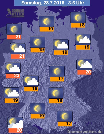In der folgenden Nacht ist der Himmel über dem Osten und westlich des Rheins teils wechselnd bewölkt, sonst ist es dagegen verbreitet sternenklar, dazu bleibt es trocken. Die Temperatur sinkt auf 23 Grad in Köln und bis 17 Grad im Grabfeld.