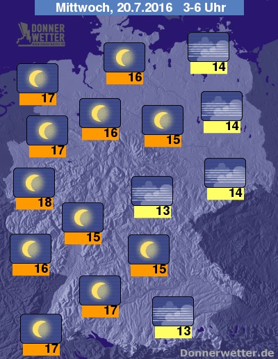 In der folgenden Nacht bleibt der Himmel landesweit sternenklar, dazu bleibt es auch trocken. Die Temperatur sinkt auf 18 Grad in Aachen und bis 13 Grad im Grabfeld.