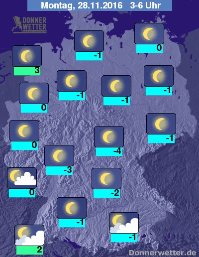In der folgenden Nacht klart der Himmel über dem Bundesgebiet verbreitet auf. Vor allem im Süden bleibt es jedoch zunächst auch noch oft stärker bewölkt, dazu aber ebenfalls trocken. Im weiteren Verlauf lockert es aber auch hier auf. Die Temperatur sinken auf mehrheitlich frostige Werte zwischen 3 und -4 Grad.