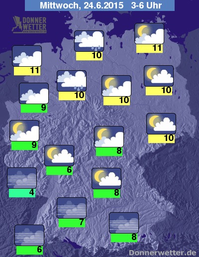 In der Nacht zum Mittwoch halten sich vor allem im Norden oft noch dichte Wolken aus denen hin und wieder etwas Regen fallen kann. Im Süden des Landes ist es hingegen meist sternenklar und dabei trocken, gebietsweise kann sich jedoch Nebel oder Dunst bilden. Im übrigen Bundesgebiet zieht meist aufgelockerte, oft aber auch lockere Bewölkung durch und es bleibt dabei weitgehend trocken. Die Temperatur sinkt auf 11 Grad in Rostock und etwa 4 Grad am Pfälzer Wald.