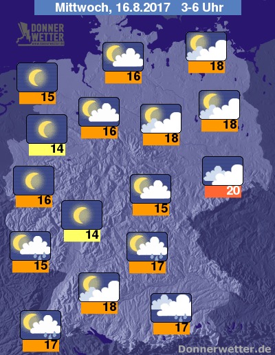 In der kommenden Nacht bleibt es über der Südosthälfte Deutschlands noch meist stark bewölkt und es bilden sich wiederholt Schauer und örtliche Gewitter. Im übrigen Land lockert und klart der Himmel hingegen größtenteils auf und von wenigen Ausnahmen abgesehen bleibt es auch trocken. Die Temperatur sinkt auf warme 20 Grad in Dresden und bis auf etwa 14 Grad am Taunus.