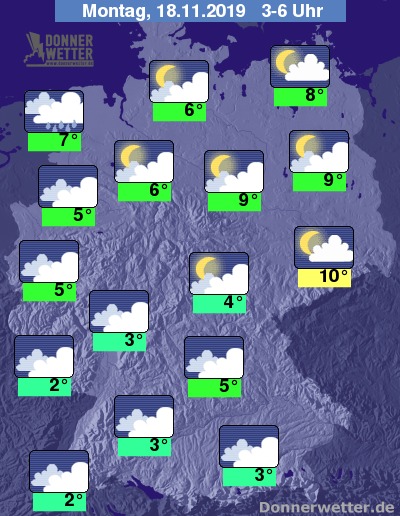 Am Montag halten sich oft dichte Wolken und es fällt zeitweise Regen, in höheren Lagen auch Schneeregen oder Schnee. Im Tagesverlauf lockert die Bewölkung phasenweise vor allem im Osten, teils auch im Süden auf, zeitweise fällt aber auch hier weiterer Regen. Die Temperatur steigt auf 3 Grad am Pfälzer Wald und bis 11 Grad in Neubrandenburg.