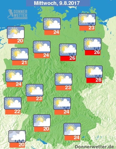 Am Mittwoch ist es häufig heiter oder sonnig, hier und da aber auch stark bewölkt. Im Süden und Südosten bilden sich dazu gebietsweise auch Schauer oder Gewitter, sonst bleibt es dagegen weitgehend trocken. Die Temperatur steigt auf 20 Grad an der Nordseeküste bis 27 Grad.