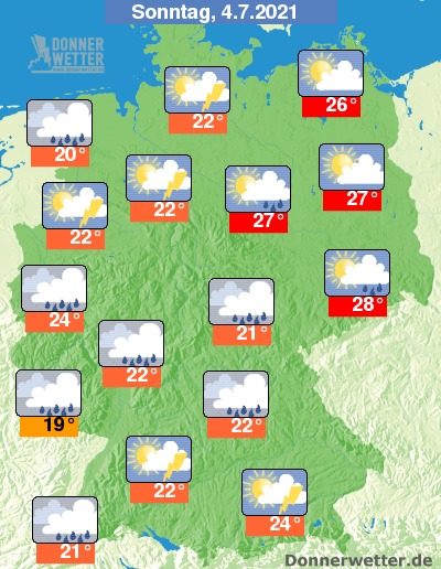 Am Sonntag zieht wechselnde, häufig jedoch starke Bewölkung durch, vor allem über der Südwesthälfte bilden sich im Tagesverlauf vielerorts Schauer und auch lokale Gewitter. Die Temperatur steigt auf 19 Grad im Saargau und bis 28 Grad in der Lausitz.