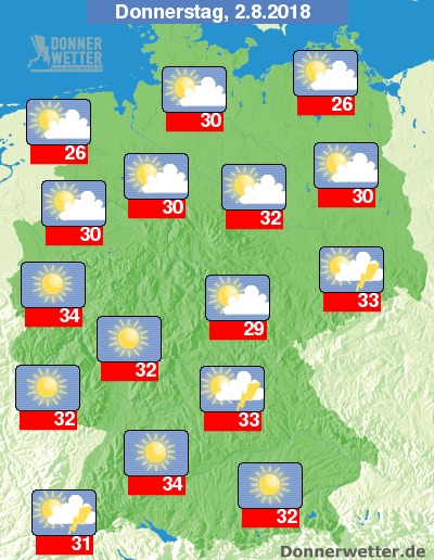 Am Donnerstag ist es größtenteils heiter bis sonnig, in den östlichen Landesteilen und um den Schwarzwald herum ziehen zum Teil einige Wolken auf, die hier vereinzelt Schauer oder Gewitter bringen können, sonst bleibt es aber weitgehend trocken. Die Temperatur steigt auf 26 Grad an den Küsten und bis 34 Grad im Rheinland.