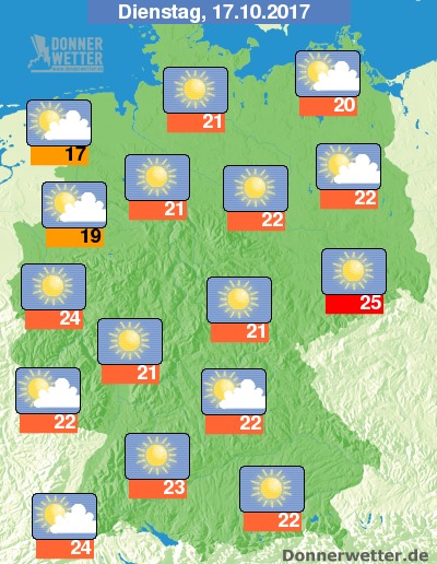 Am Dienstag ist es verbreitet heiter oder sonnig, gebietsweise können auch mal einige Wolken durchziehen, dabei bleibt es trocken. Die Temperatur steigt auf 17 Grad an der Nordseeküste und bis 25 Grad in Dresden.