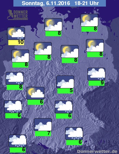 Heute Abend bleibt es im Süden und Osten und auch über der Mitte des Landes bedeckt, dazu fällt über Baden-Württemberg und Bayern zeitweise, am Alpenrand auch teils langanhaltender Regen, sonst bleibt es weitgehend trocken. Im Norden und im Westen ist es hier und da ebenfalls stark bewölkt, dabei ist auch etwas Regen möglich, häufig sind aber auch Auflockerungen möglich. Die Abendwerte liegen bei 10 Grad an der Nordsee und bis 5 Grad im Grabfeld.
