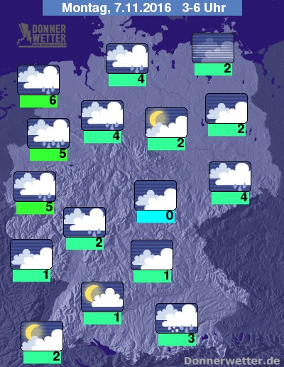 In der Nacht zum Montag bleibt es in einem breiten Streifen vom Südwesten Deutschlands bis in den Nordosten verbreitet trocken bei teils starker, teils aufgelockerter Bewölkung. Nordwestlich und südöstlich dieses Bereichs halten sich jedoch weitgehend dichte Wolken aus denen zeitweise Regen, vor allem nach Südosten hin auch regional Schneeregen oder Schnee fällt. Dazu besteht stellenweise Glättegefahr! Die Temperatur sinkt auf 6 Grad im nördlichen Emsland und bis 0 Grad am Thüringer Schiefergebirge.