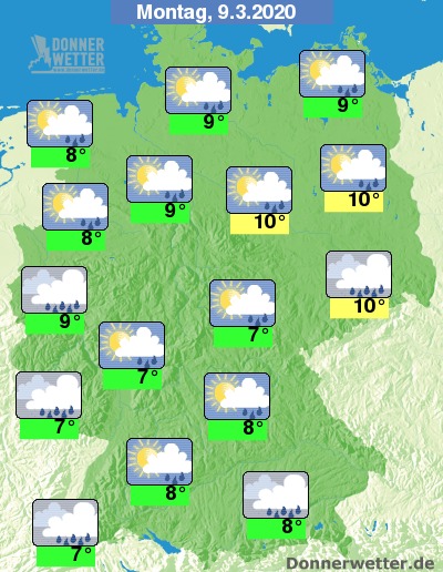Am Montag zieht den Tag über aufgelockerte bis starke Bewölkung durch, dabei bilden sich einzelne Schauer, die zum Teil auch mit Schnee oder Graupel durchsetzt sein können. Die Temperatur steigt auf 7 Grad im Saargau und bis 10 Grad in Berlin.