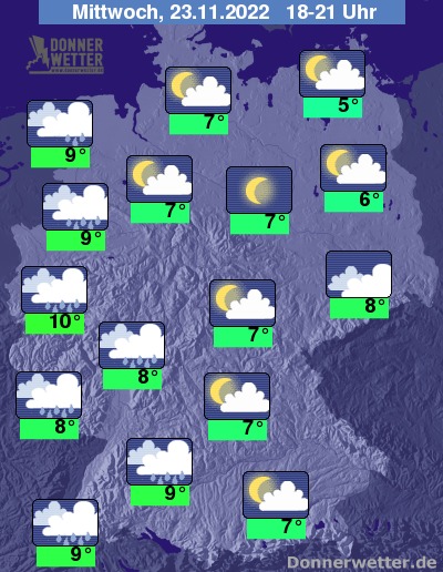 Heute Abend ziehen vom Südwesten, über den Westen bis hoch zur Nordsee kompakte Wolken mit Regen auf. Weiter nach Osten hin zeigt sich der Himmel oft noch locker bis aufgelockert bewölkt, teils auch sternenklar, hier bleibt es trocken. Die Temperatur liegt bei 5 Grad in Neubrandenburg und 10 Grad in Köln.