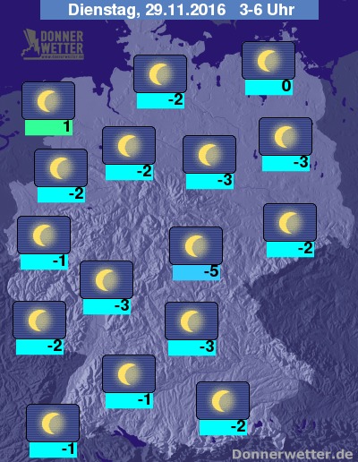 In der kommenden Nacht zeigt sich der Himmel über Deutschland verbreitet sternenklar, dabei bleibt es natürlich trocken. Die Temperatur sinkt auf 1 Grad im nördlichen Emsland und bis auf frostige -5 Grad im Eichsfeld.