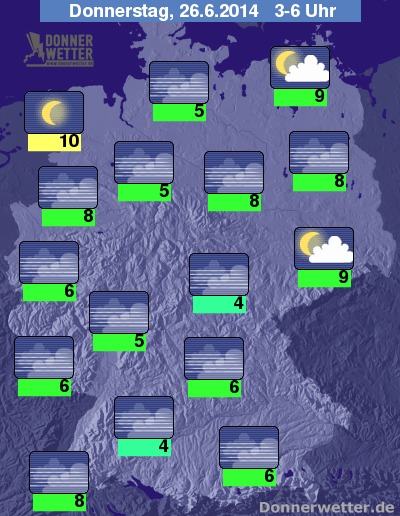 In der Nacht fallen im Süden und Osten noch letzte Schauer, sonst ist es bereits vielfach sternenklar oder nur locker bewölkt und trocken. Im Laufe der Nacht kann sich jedoch gebietsweise hochnebelartige Bewölkung ausbilden, zum Teil wird es auch neblig-trüb. Dazu sinken die Temperaturen bis zum Morgen auf 10 Grad in Emden und 4 Grad an der Schwäbischen Alb.