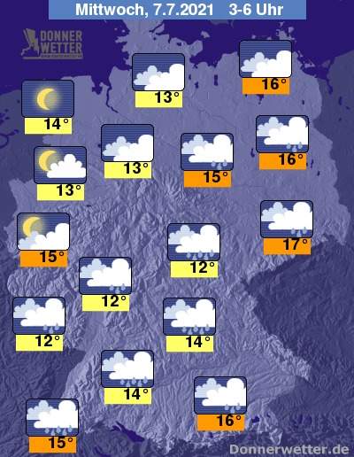 In der Nacht zum Mittwoch ist es im Nordwesten meist sternenklar, im übrigen Norden und Westen teils aufgelockert, teils stark bewölkt, jedoch zumeist trocken. Im großen Rest der Republik halten sich dichte Wolken und es fällt verbreitet Regen. Die Temperatur sinkt auf 17 Grad in Dresden und bis 12 Grad in Saarbrücken.