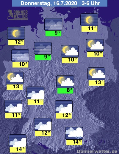 In der Nacht zum Donnerstag fällt vor allem im Südosten und in den östlichen Landesteilen noch gebietsweise Regen, auch sonst ist es im Süden und Osten meist noch stark bewölkt, aber schon meist trocken. Im übrigen Bundesgebiet ist es meist locker bewölkt oder sternenklar und dazu weitgehend trocken. Die Temperatur sinkt auf 14 Grad in München und etwa 8 Grad am Thüringer Wald.