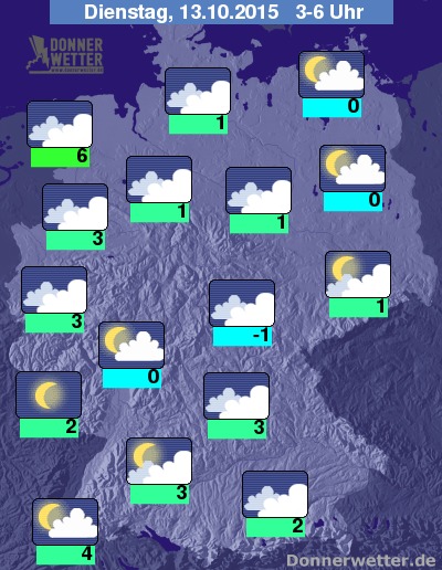 In der kommenden Nacht bleibt der Himmel über Deutschland verbreitet stark bewölkt oder bedeckt. Einige Auflockerungen zeigen sich allerdings vor allem in den östlichsten Landesteilen sowie im Südwesten des Landes, wo der Himmel gebietsweise sogar aufklart. Im äußeren Südosten ist hier und da Regen möglich, sonst bleibt es aber landesweit trocken. Die Temperatur sinkt auf 6 Grad an der Nordsee und bis auf frostige -1 Grad im Altenburger Land.