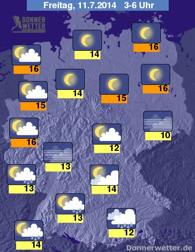 Heute Nacht bilden sich bei oft dichten Wolken besonders im Süden noch einige Schauer, sonst lockert die Bewölkung auch in der breiten Mitte meist auf und die Schauer klingen nach und nach ab. Im Norden wird es sogar verbreitet klar. Die Temperatur sinkt auf 16 Grad im Rheinland und etwa 10 Grad am Erzgebirgsrand.