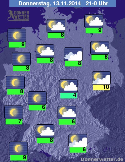 In der Nacht zum Freitag ist es zunächst noch gebietsweise sternenklar, sonst zieht jedoch meist lockere bis aufgelockerte Bewölkung durch, örtlich halten sich auch dichte Wolken. Von der Mitte bis in den Süden des Landes bildet sich stellenweise Nebel oder Hochnebel. Es bleibt überall trocken. Die Temperatur sinkt auf 8 Grad in Berlin und etwa 4 Grad am Alpenrand.